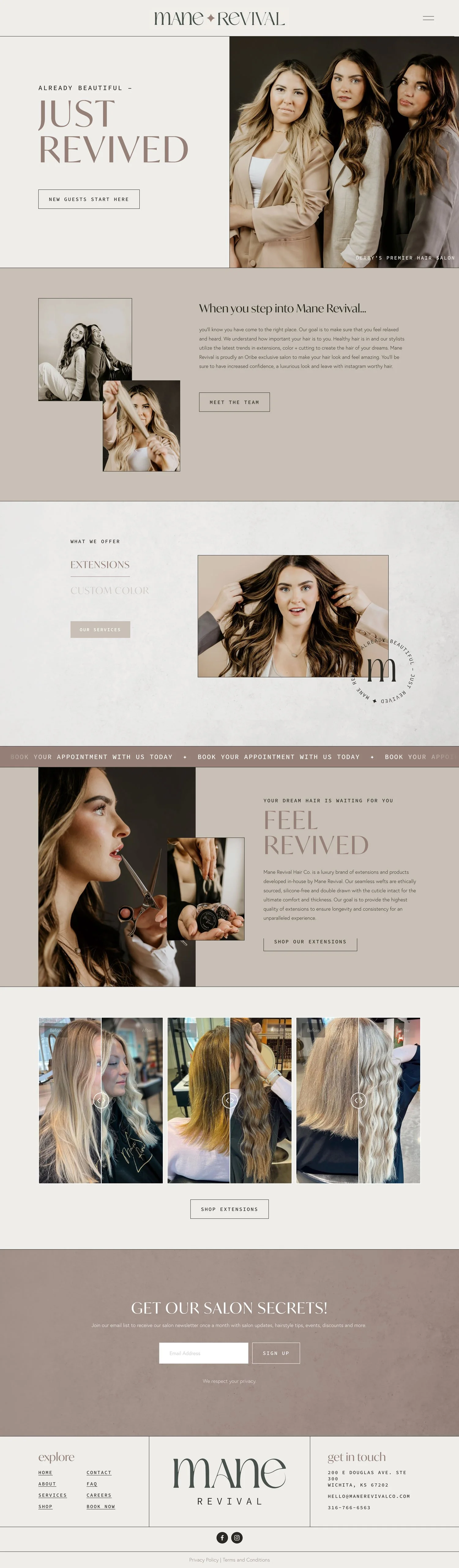 Mane Revival is a bespoke extension hair salon, located in Wichita, Kansas. Their mission is to help women feel beautiful by reviving their hair to its fullest potential. We elevated their brand through strong imagery, bold typography and unique submarks.